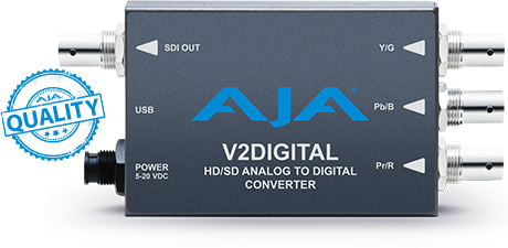 V2Digital и V2Analog конвертируют аналоговое видео в цифровое и цифровое в аналоговое, поддерживая HD/SD-SDI и YPbrPr/RGB сигнал изображения и синхронизации. Устройства можно подключать по USB с помощью программного обеспечения AJA MiniConfig для Mac и ПК; вы получите 10-битную высококачественную конвертацию в одном маленьком, но высокопроизводительном устройстве